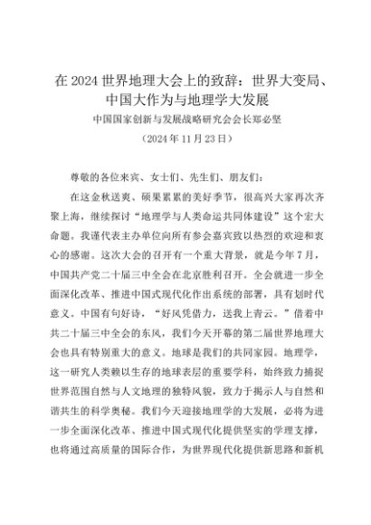 领导讲话:20241123在2024世界地理大会上的致辞:世界大变局、中国大作为与地理学大发展——中国国家创新与发展战略研究会会长郑必坚