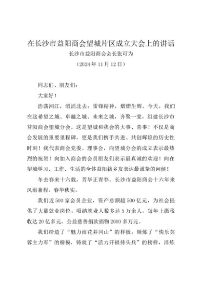 / 领导讲话:20241112在长沙市益阳商会望城片区成立大会上的讲话——长沙市益阳商会会长张可为