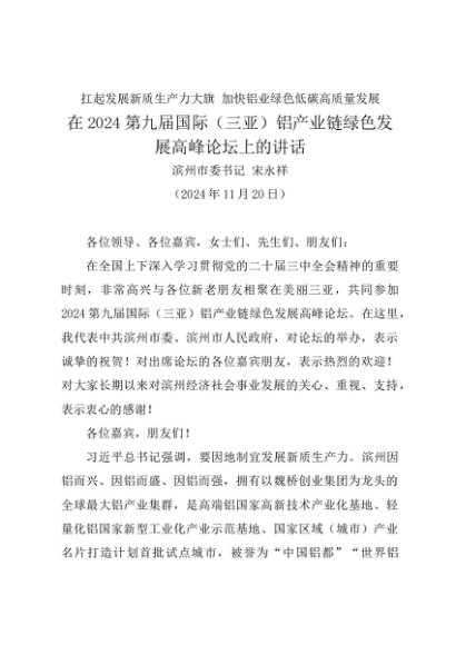 / 领导讲话:20241120在2024第九届国际(三亚)铝产业链绿色发展高峰论坛上的讲话——滨州市委书记 宋永祥