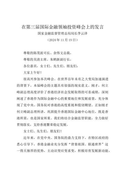 / 领导讲话:20241119在第三届国际金融领袖投资峰会上的发言——国家金融监督管理总局局长李云泽