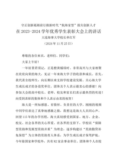/ 领导讲话:20241125在2023-2024学年优秀学生表彰大会上的讲话——大连海事大学校长单红军