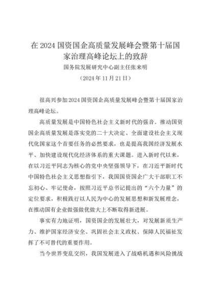 领导讲话:20241121在2024国资国企高质量发展峰会暨第十届国家治理高峰论坛上的致辞——国务院发展研究中心副主任张来明