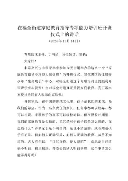 / 领导讲话:20241114在福全街道家庭教育指导专项能力培训班开班仪式上的讲话