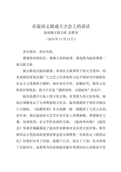 领导讲话:20241112在陡岗文联成立大会上的讲话——陡岗镇文联主席 岳梦龙