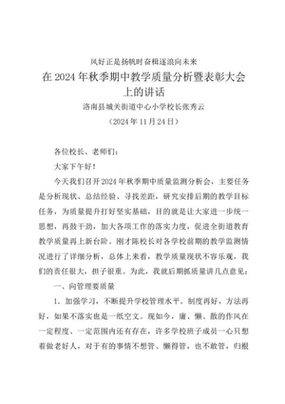 / 领导讲话:20241124在2024年秋季期中教学质量分析暨表彰大会上的讲话——洛南县城关街道中心小学校长张秀云