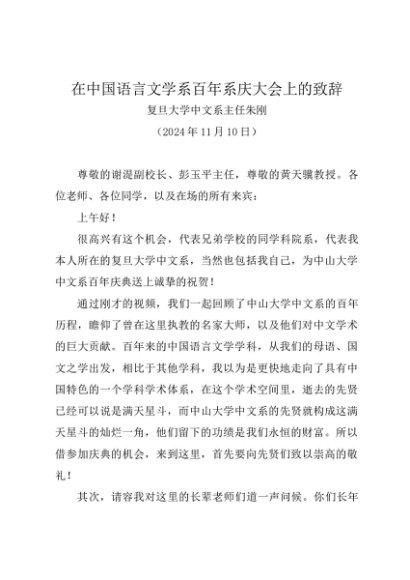 / 领导讲话:20241110在中国语言文学系百年系庆大会上的致辞——复旦大学中文系主任朱刚