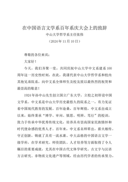 / 领导讲话:20241110在中国语言文学系百年系庆大会上的致辞——中山大学哲学系主任张伟