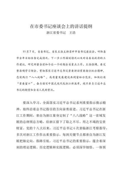 / 领导讲话:20241107在市委书记座谈会上的讲话提纲——浙江省委书记 王浩