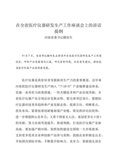 / 领导讲话:20241107在全省医疗仪器研发生产工作座谈会上的讲话提纲——河南省委书记楼阳生