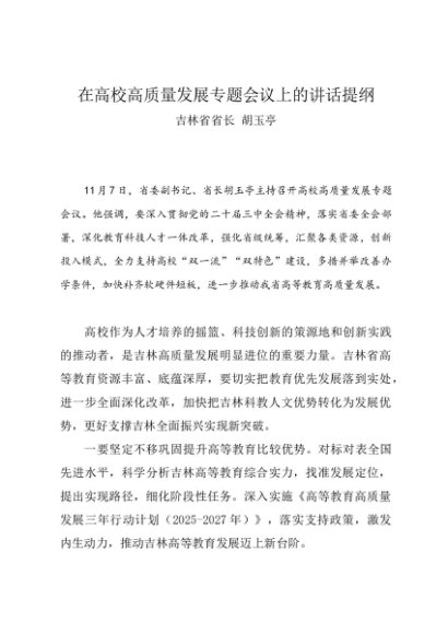 / 领导讲话:20241107在高校高质量发展专题会议上的讲话提纲——吉林省省长 胡玉亭