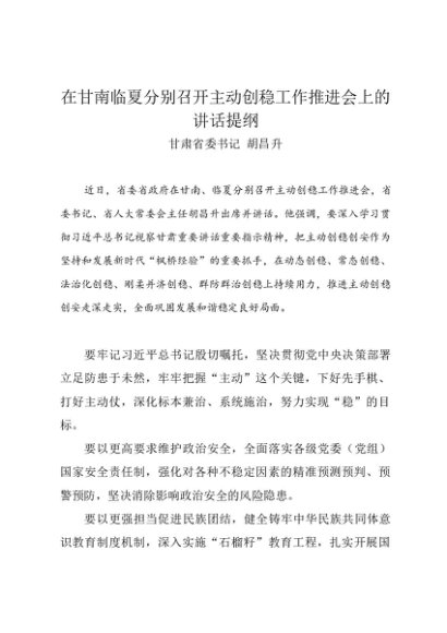 / 领导讲话:20241107在甘南临夏分别召开主动创稳工作推进会上的讲话提纲——甘肃省委书记 胡昌升