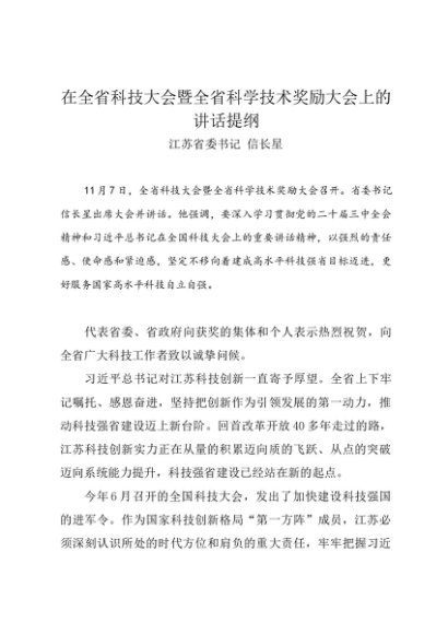 / 领导讲话:20241107在全省科技大会暨全省科学技术奖励大会上的讲话提纲——江苏省委书记 信长星