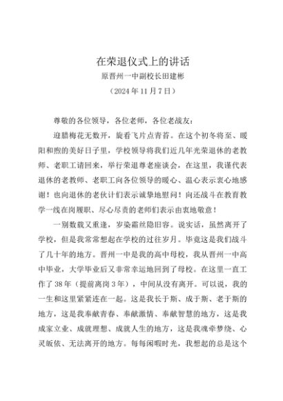 领导讲话:20241107在荣退仪式上的讲话——原晋州一中副校长田建彬