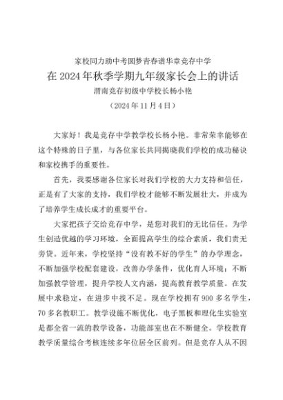 / 领导讲话:20241104在2024年秋季学期九年级家长会上的讲话——渭南竞存初级中学校长杨小艳