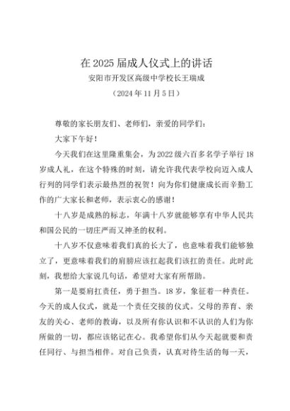 / 领导讲话:20241105在2025届成人仪式上的讲话——安阳市开发区高级中学校长王瑞成