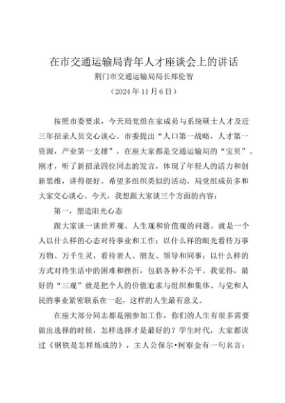 / 领导讲话:20241106在市交通运输局青年人才座谈会上的讲话——荆门市交通运输局局长郑伦智