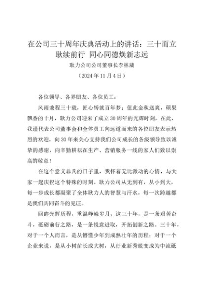 / 领导讲话:20241104在公司三十周年庆典活动上的讲话——耿力公司公司董事长李林葳