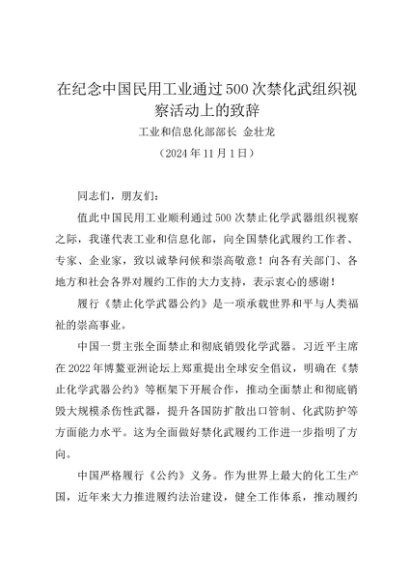 / 领导讲话:20241101在纪念中国民用工业通过500次禁化武组织视察活动上的致辞——工业和信息化部部长 金壮龙