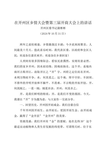 / 领导讲话:20241031在开州区乡情大会暨第三届开商大会(招商引资)上的讲话——开州区委书记蒲彬彬