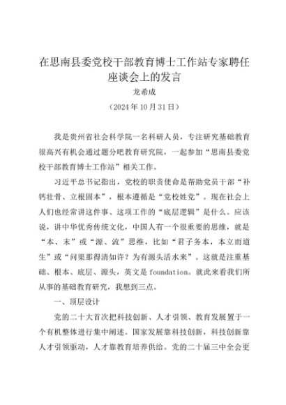 / 领导讲话:20241031在思南县委党校干部教育博士工作站专家聘任座谈会上的发言