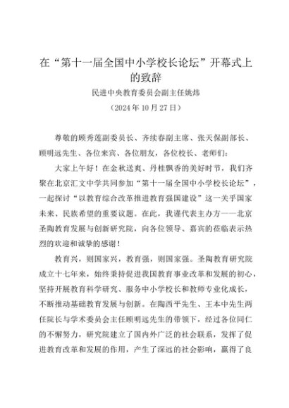 / 领导讲话:20241027在“第十一届全国中小学校长论坛”开幕式上的致辞——民进中央教育委员会副主任姚炜