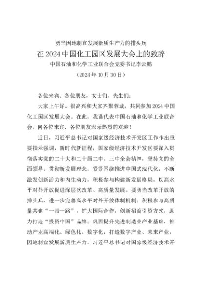 / 领导讲话:20241030在2024中国化工园区发展大会上的致辞——中国石油和化学工业联合会党委书记李云鹏