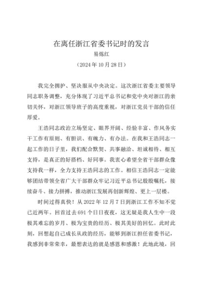 领导讲话:20241028在离任浙江省委书记时的发言——浙江原省委书记易炼红