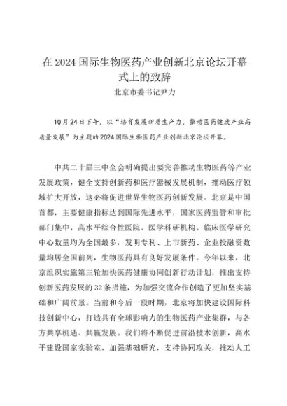 / 领导讲话:20241024在2024国际生物医药产业创新北京论坛开幕式上的致辞——北京市委书记尹力