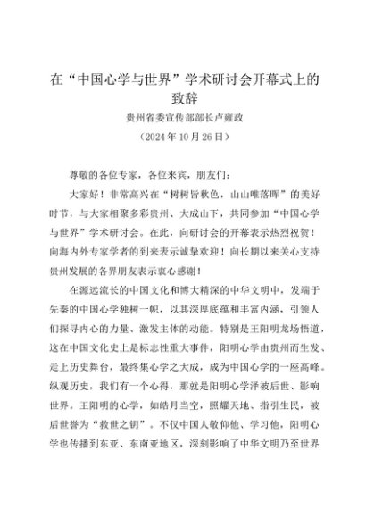 领导讲话:20241026在“中国心学与世界”学术研讨会开幕式上的致辞——贵州省委宣传部部长卢雍政