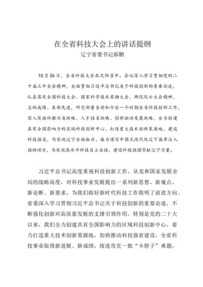 / 领导讲话:20241026在全省科技大会上的讲话提纲——辽宁省委书记郝鹏