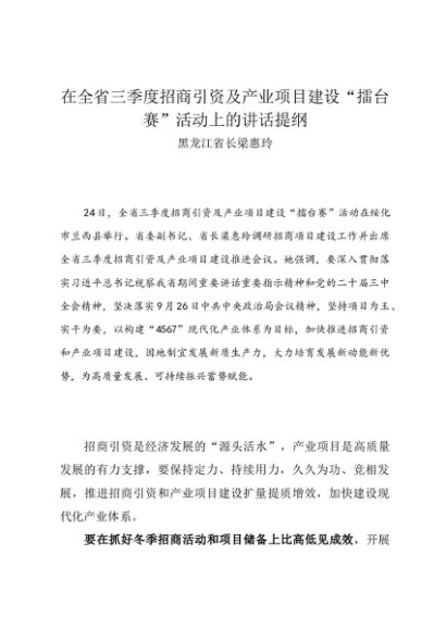 / 领导讲话:20241024在全省三季度招商引资及产业项目建设“擂台赛”活动上的讲话提纲——黑龙江省长梁惠玲