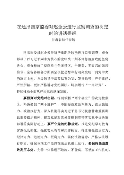 / 领导讲话:20241026在通报国家监委对赵金云进行监察调查的决定时的讲话提纲——甘肃省长任振鹤