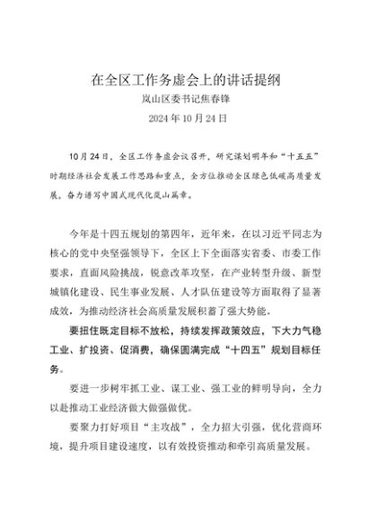 / 领导讲话:20241024在全区工作务虚会上的讲话提纲——岚山区委书记焦春锋