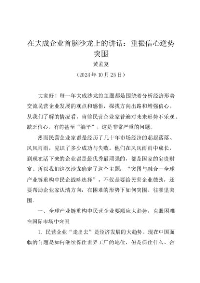 / 领导讲话:20241025在大成企业首脑沙龙上的讲话:重振信心逆势突围