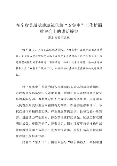 / 领导讲话:20241025在全省县城就地城镇化和“双集中”工作扩面推进会上的讲话提纲——湖北省长王忠林