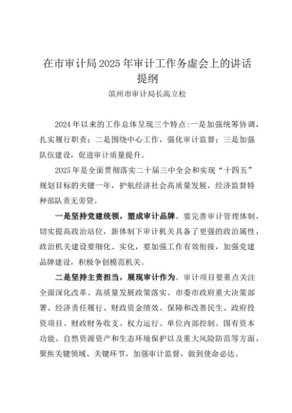 / 领导讲话:20241025在市审计局2025年审计工作务虚会上的讲话提纲——滨州市审计局长高立松