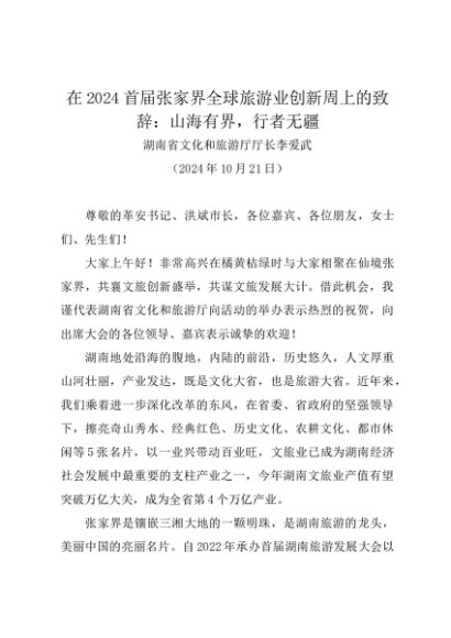 领导讲话:20241021在2024首届张家界全球旅游业创新周上的致辞——湖南省文化和旅游厅厅长李爱武