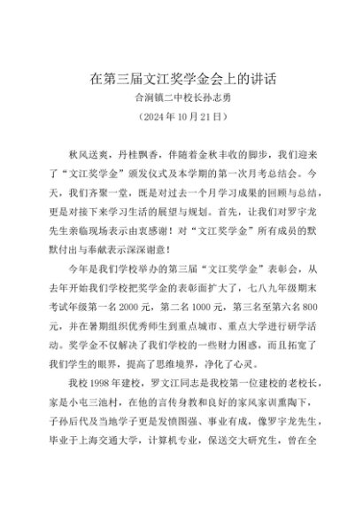/ 领导讲话:20241021在第三届文江奖学金会上的讲话——合涧镇二中校长孙志勇