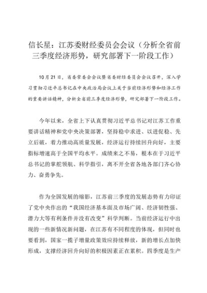 / 领导讲话:20241021信长星:江苏委财经委员会会议(分析全省前三季度经济形势,研究部署下一阶段工作)