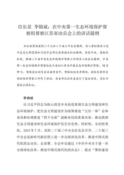 领导讲话:20241019信长星 李锦斌:在中央第一生态环境保护督察组督察江苏省动员会上的讲话提纲