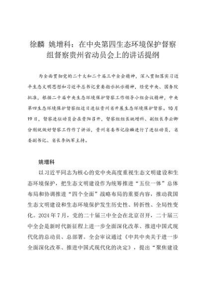 领导讲话:20241019徐麟 姚增科:在中央第四生态环境保护督察组督察贵州省动员会上的讲话提纲