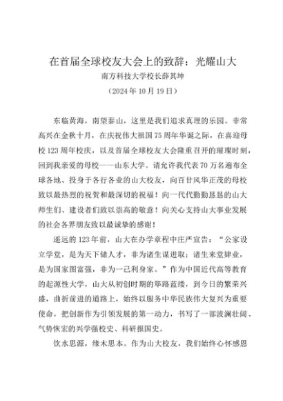 领导讲话:20241019在首届全球校友大会上的致辞:光耀山大——南方科技大学校长薛其坤