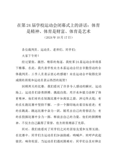 / 领导讲话:20241017在第24届学校运动会闭幕式上的讲话:体育是精神、体育是财富、体育是艺术