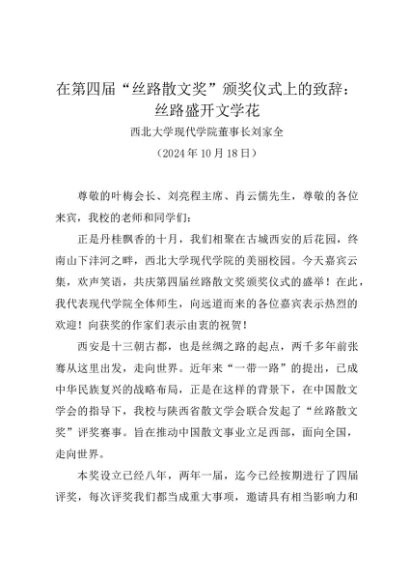 领导讲话:20241018在第四届“丝路散文奖”颁奖仪式上的致辞:丝路盛开文学花——西北大学现代学院董事长刘家全