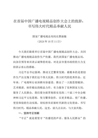 领导讲话:20241011在首届中国广播电视精品创作大会上的致辞:书写伟大时代精品奉献人民——国家广播电视总局局长曹淑敏