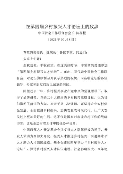 / 领导讲话:20241008在第四届乡村振兴人才论坛上的致辞——中国社会工作联合会会长 陈存根
