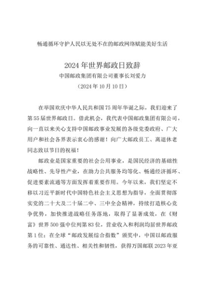 / 领导讲话:20241010.2024年世界邮政日致辞——中国邮政集团有限公司董事长刘爱力docx