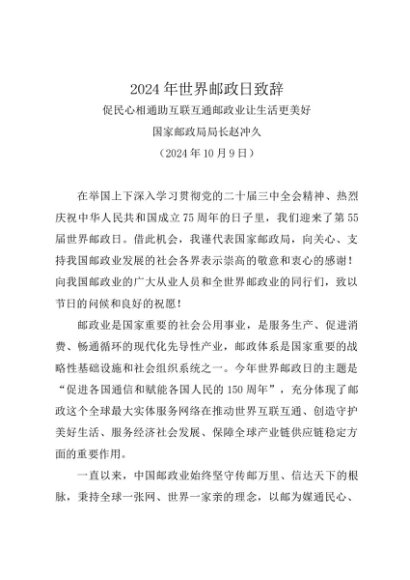 / 领导讲话:20241009世界邮政日致辞——国家邮政局局长赵冲久