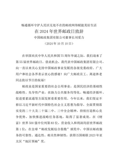/ 领导讲话:20241010在2024年世界邮政日致辞——中国邮政集团有限公司董事长刘爱力