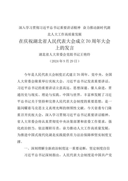 / 领导讲话:20240929在庆祝湖北省人民代表大会成立70周年大会上的发言——湖北省人大常委会党组书记王艳玲